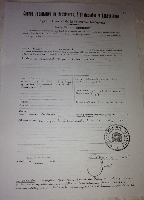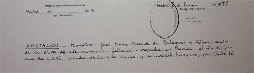 Transkription und Übersetzung: „Da Msgr. José María Escrivá de Balaguer y Albás, Autor der unter dieser Registernummer erfassten Werke, beglaubigtermaßen in Rom am 26. Juni 1.975 gestorben ist, wurde als lt. Urteil Nr. 9 des h. o. Gerichts in erster Instanz zum Alleinerben der Bruder des Verstorbenen, Herr Santiago Escrivá de Balaguer y Albás, erklärt, der die Erbschaft annahm, inbegriffen das geistige Eigentum an den Schriften des Verstorbenen, die für den Preis von zwei Millionen Peseten dem SCRIPTOR-Verlag überlassen wurden, der nun das geistige Eigentum daran innehat. Die diesbezügliche Registrierungsnummer lautet 87.379, Bl. 379 in Bd. 289. Madrid, 8. Januar 1977. Generalregister.