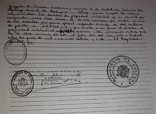 Und es stellte sich heraus, dass jene Werke, die bis zu seinem Tod geistiges Eigentum von Escrivá waren, laut der nachstehenden Urkunden mangels eines Testament seinem gesetzlichen Erben zugeschlagen wurden, zusammen mit dem Erlös für eben dieses geistige Eigentum.
