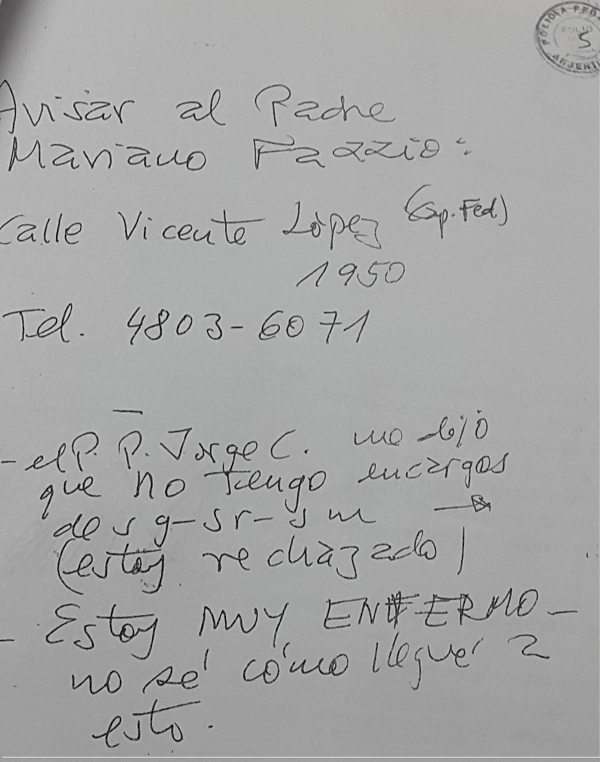 «Hinweis an Don Mariano Fazzio: Straße Vicente López (Cap. Fed.) 1950 Tel. 4803-6071. Don P. Jorge C. Sagte mir, dass ich keine Aufträge von sg -sr -sm bekomme (dass ich zurückgewiesen bin). Es geht mir SEHR SCHLECHT – und ich weiß nicht, wie ich dazu gekommen bin.»