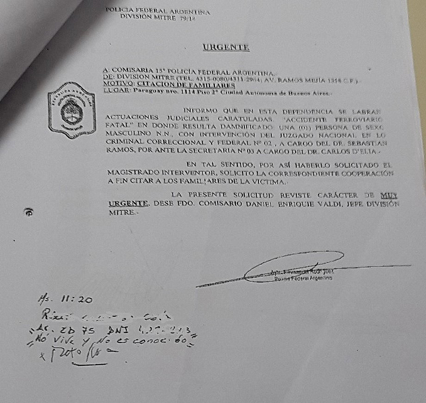 Allerdings geschah am folgenden Tag, Donnerstag, dem 6. März, etwas Bemerkenswertes: Die Polizei besuchte um 11.20 h ein Zentrum des Opus Dei, um über das Geschehene zu informieren und das Einschreiten eines „Angehörigen“ zu veranlassen, der das Opfer identifizieren könne. Der ältere Numerarier, der die Polizei empfing, sagte unglaublicherweise „Er lebt nicht hier und „er ist uns nicht bekannt“ (siehe unten das Protokoll der Argentinischen Bundespolizei mit dem Namen des betreffenden Numerariers);