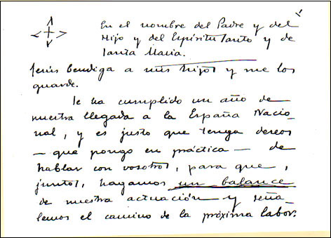 Hilfe von außen? Das wird nur in ganz wenigen Fällen angebracht sein. Wir haben da traurige Erfahrungen gemacht. Es ist sehr leicht möglich, dass diese augenblickliche wirtschaftliche Hilfe da Hindernis einer Indiskretion mit sich bringt, oder andere die wir während unseres Aufenthalts im roten Madrid beklagen mussten. Wir! Nur wir – mit Ihm – müssen alle wirtschaftlichen Schwierigkeiten lösen. Überlegt es in Ruhe, und ihr werdet sehen, dass es keine andere Lösung gibt.